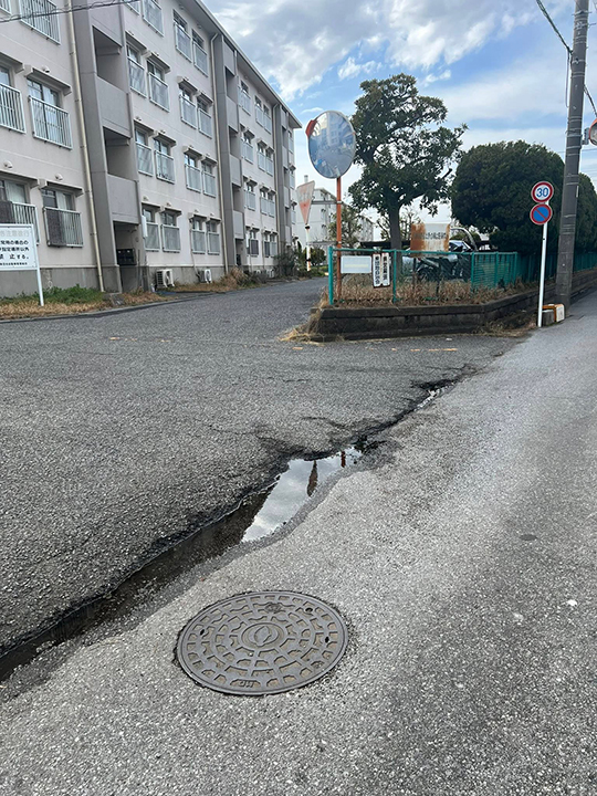 現場では、県営住宅のスロープが市道の排水溝まで侵しており、水はけが悪くなっていました。